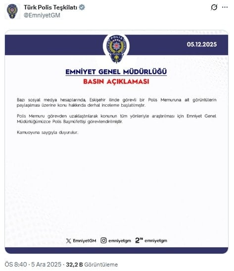 “Bazı sosyal medya hesaplarında Eskişehir ilinde görevli bir Polis Mensubuna ait görüntülerin paylaşılması üzerine konu hakkında derhal inceleme başlatılmıştır.