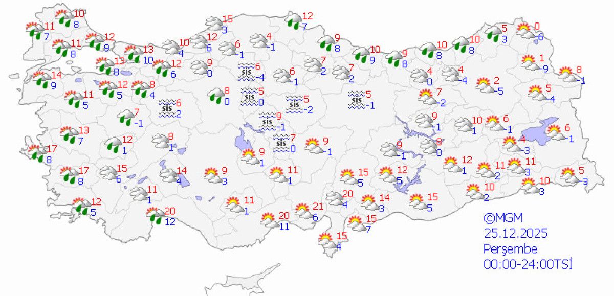 Ülke genelinde parçalı bulutlu, iç bölgelerde hafif kar ihtimali öngörülüyor.